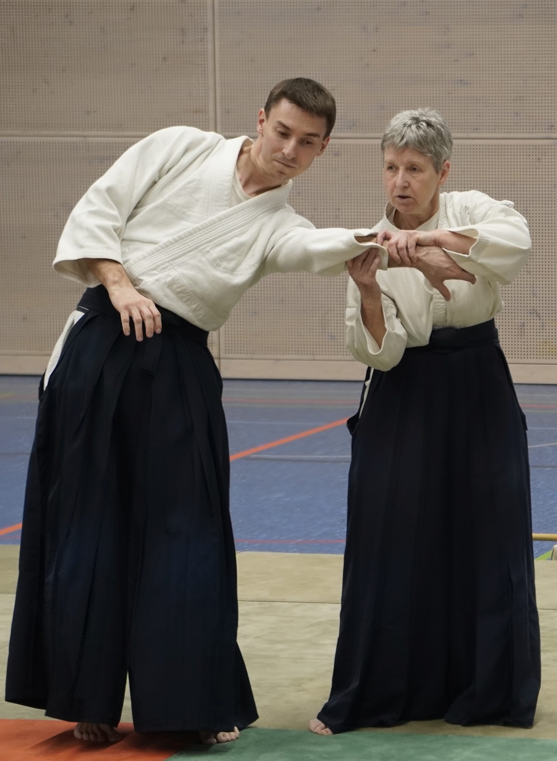 Ainsi, après une séance consacrée à l’Aikitaiso, Karoline Bauer est revenue aux techniques d’aïkido pratiquées avec le corps et le bokken, qui permettent davantage d’élan et de chutes. Cela procure une tension corporelle souple et une certaine légèreté qui procurent tout simplement une sensation agréable, ce qui n’est pas forcément le cas de manière aussi immédiate avec l’Aikitaiso. Dans la partie « externe » de l’aïkido, on a de nouveau travaillé sur les petits détails ayant un grand impact, ce qui a donné lieu à de nombreuses révélations.